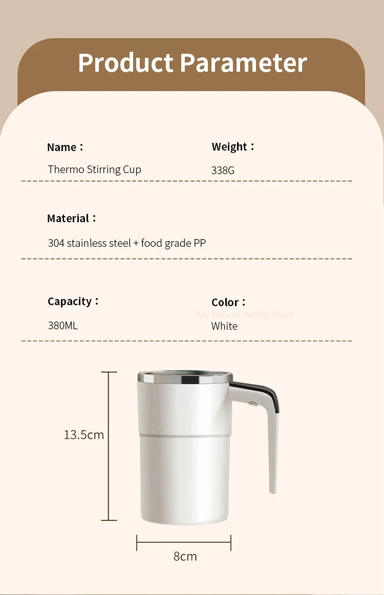 With this automatic magnetic self stirring coffee cup, you no longer need to search for spoons or handle clumped drinks. Simply put your favorite powder, such as coffee powder, protein powder, or other beverage mixtures, into the cup. Then, pour in the liquid you want, whether it’s hot water, milk, or any other liquid. Press the button to mix the powder and liquid evenly. Whether it’s at home, office, gym, school, etc., you can enjoy the perfect mixed drink anytime, anywhere!