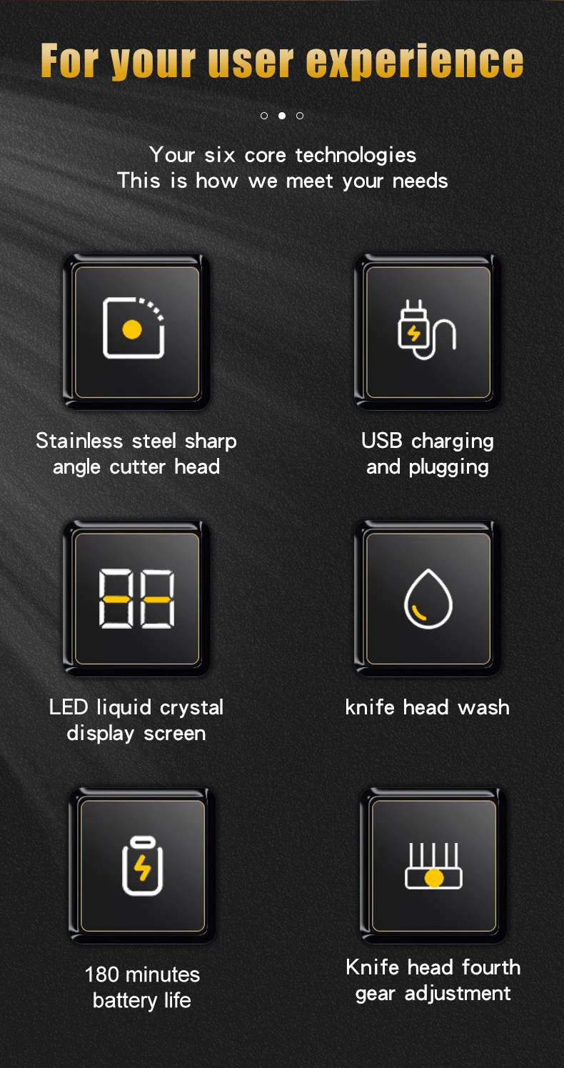 - Function: Electric length adjustment,wet haircut,dry haircut,floating head,Automatic power selection based on bristle density,Washing knives under water,Automatic cleaning,Fast Charging,Charging indication