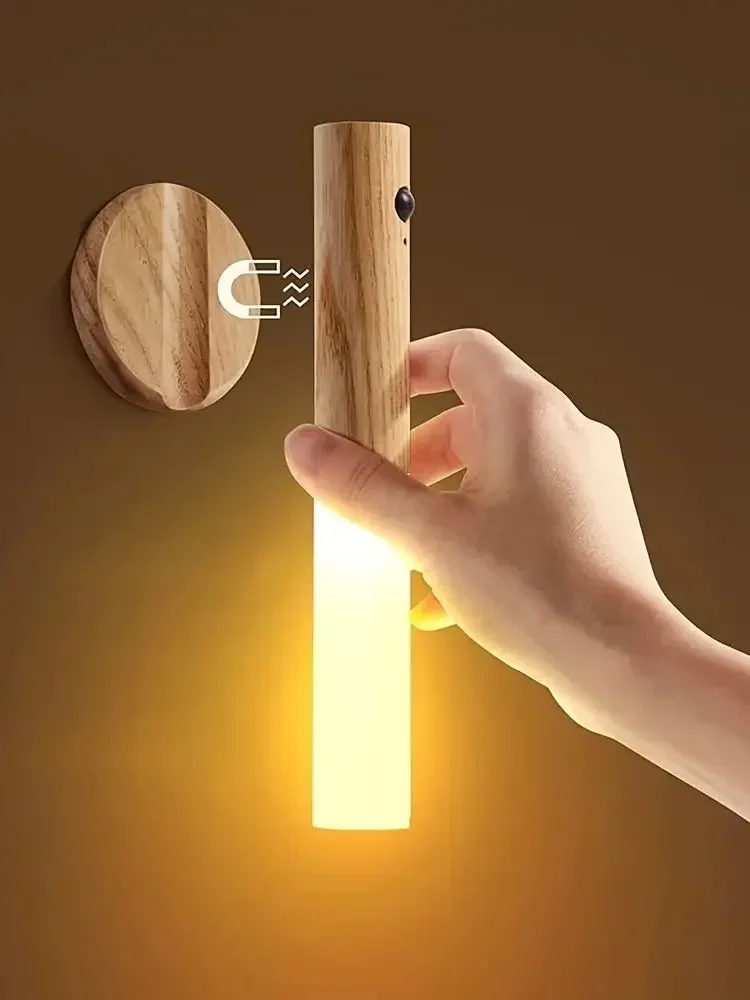 Portable Motion Sensor LED Night Light Walnut Indoor Wall Lamp Warm White USB Rechargeable Bedside Lamp for Home Bedroom